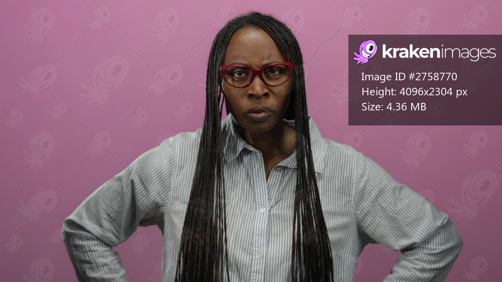 Woman with glasses and braids stands in front of an isolated pink background wall expressing emotion through gesture and gaze