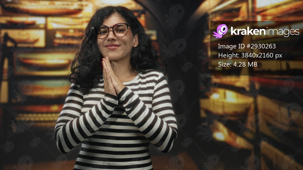 Woman with glasses claps hands softly in museum building while smiling, wearing striped top; curiosity joy.