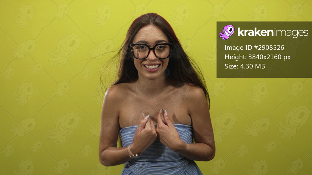 Woman with glasses clasping hands to chest showing bare shoulders in yellow studio wearing blue striped dress; gratitude warmth.