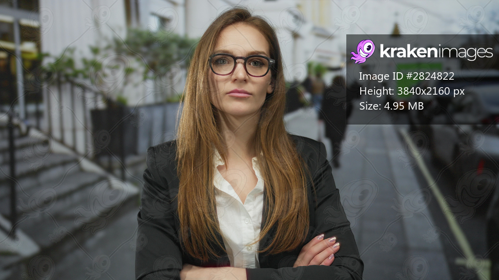 Woman with glasses and closed eyes crosses arms on busy gray city sidewalk by stone building facade; denial.