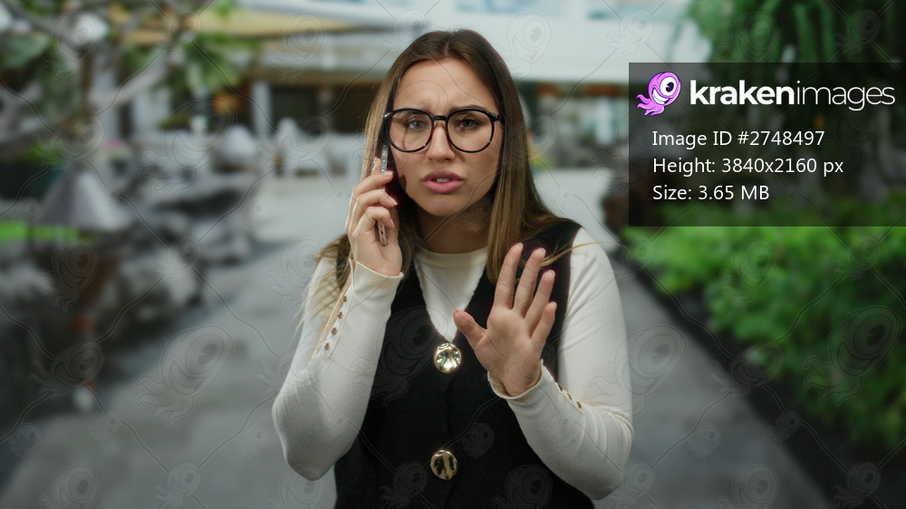 Woman with glasses communicates quietly on phone outdoors emphasizing secrecy on city street.