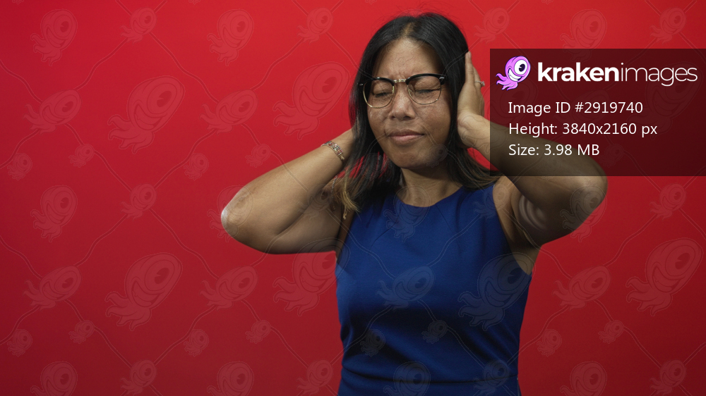 Woman with glasses covering ears and squinting, wearing blue dress in red studio; discomfort tension.