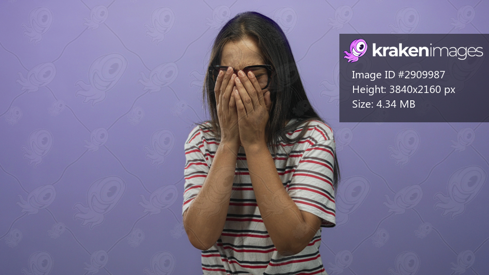 Woman with glasses covering her face with both hands in a purple studio; sadness vulnerability isolation.