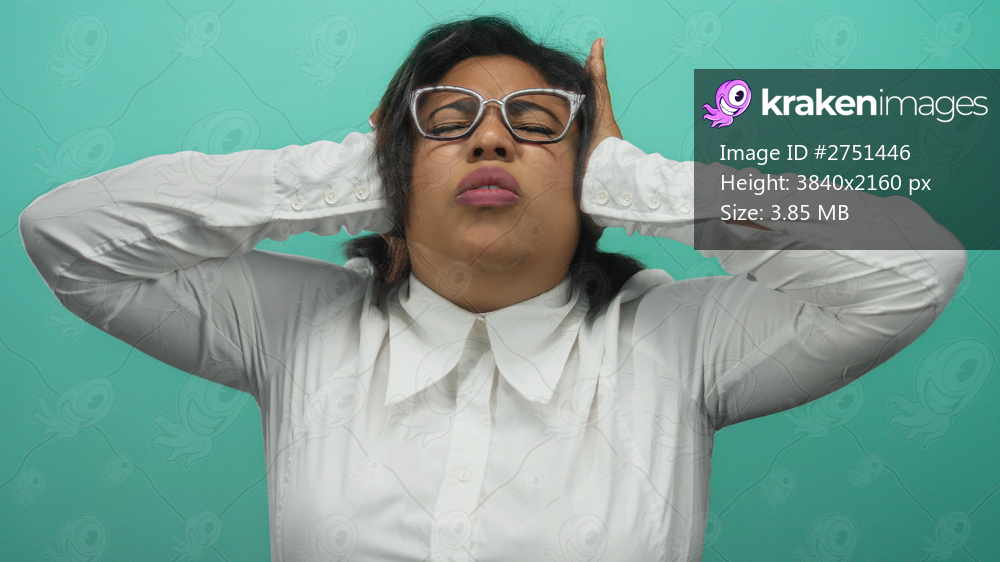 Woman with glasses covers ears expressing frustration over green background in isolated setting suggesting stress in office environment