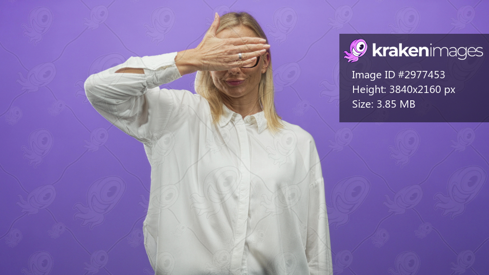 Woman with glasses covers her eyes with hand and raised arm in a studio portrait, white shirt and ring visible on finger; shyness.