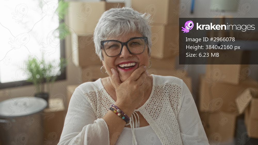 Woman with glasses covers mouth with hand while laughing among cardboard moving boxes in building; joy renewal.