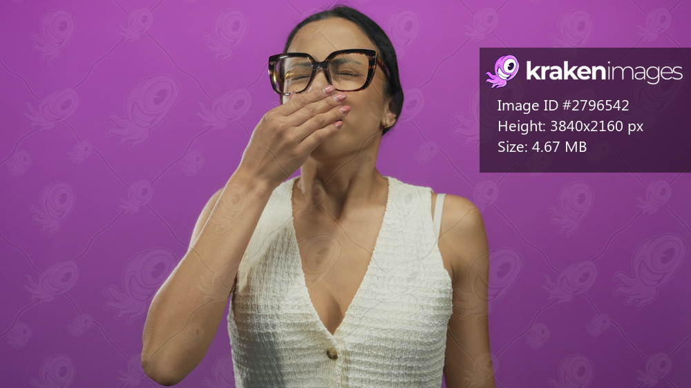 Woman with glasses covers nose sneezing in front of a pink background, wearing a white top, expressing allergy or cold symptoms suggesting discomfort.