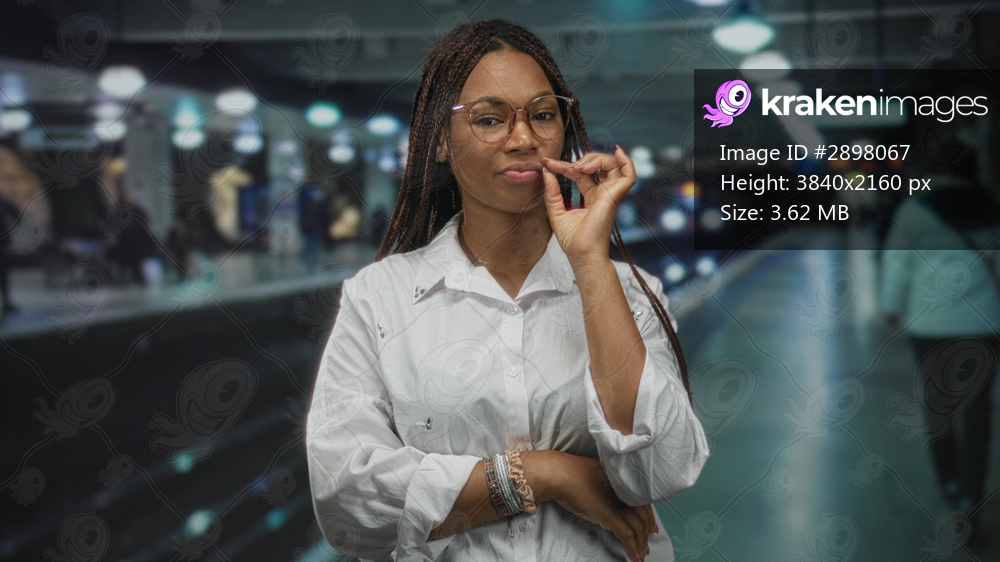 Woman with glasses crossing her arms and gesturing with one hand at a train station platform; confidence independence.