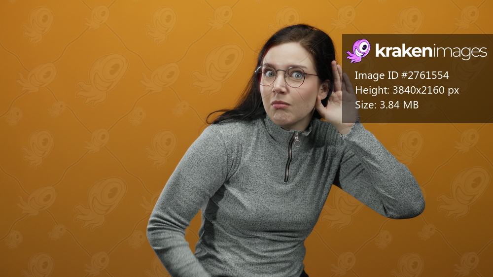 Woman with glasses displaying various facial expressions against an orange background, wearing a gray sweater, looking confused, listening, and curiously engaged. - Kraken Images