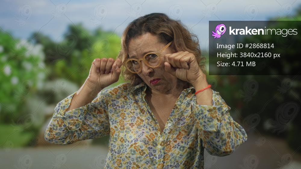 Woman with glasses and fists to eyes for crying gesture in forest path among green park plants; sadness mimicry.