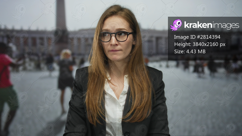 Woman with glasses frowning in vatican square under ancient saint peter colonnade; inner doubt and concern.