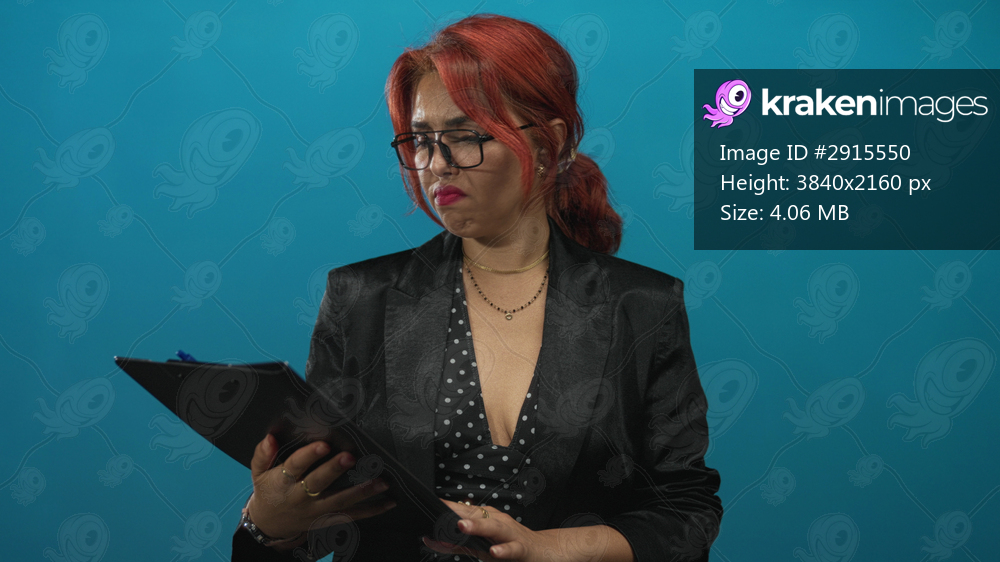 Woman with glasses frowning while holding a clipboard in studio on blue backdrop, reading notes and wearing a blazer with polka dot top; skepticism review. - Kraken Images