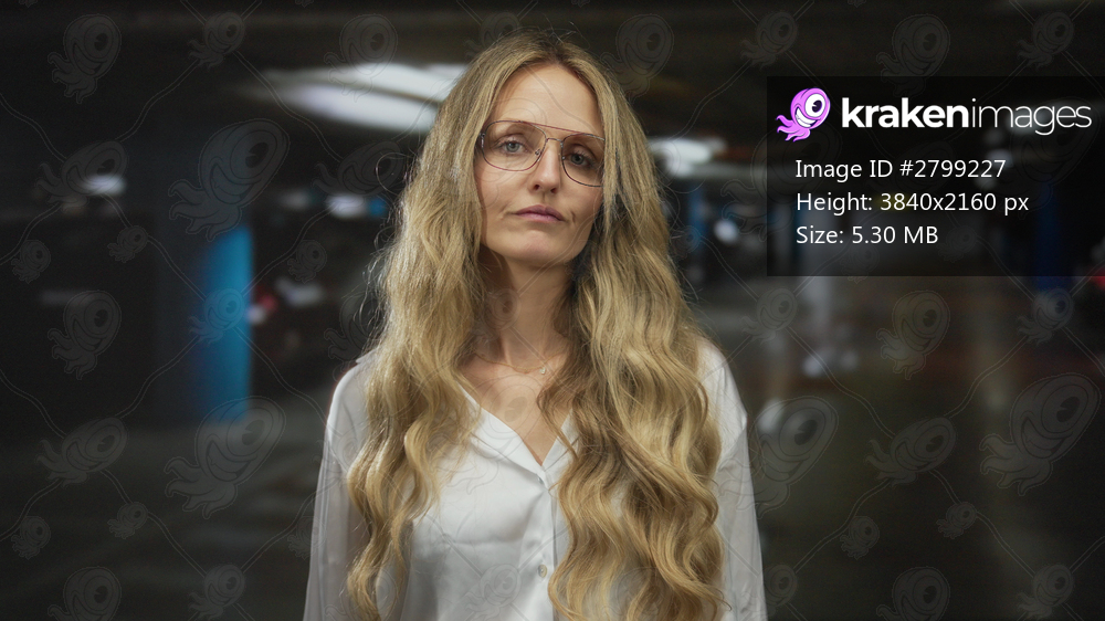 Woman with glasses gives thumbs down in a dimly lit parking garage, wearing a white shirt and showing long blonde hair, conveying disapproval indoors.
