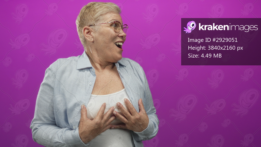 Woman with glasses and hands to chest revealing bare chest and open mouth in studio with vivid magenta background; surprise.