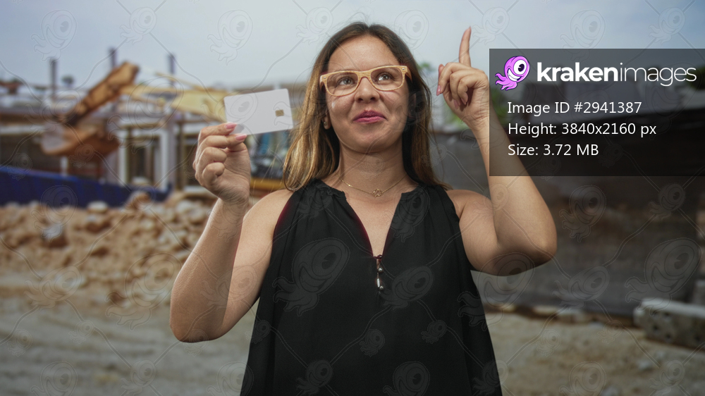 Woman with glasses holding a blank white creditcard between thumb and forefinger and smiling while standing outdoors at a building construction site with excavator in view; confidence. - Kraken Images