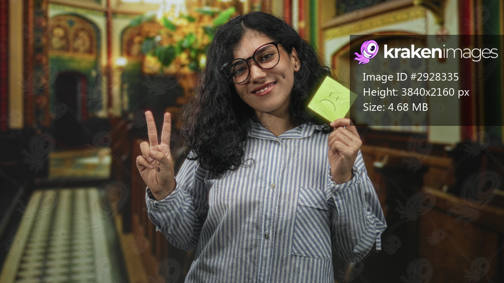 Woman with glasses holding a sad sticky note and showing peace sign inside ornate church building; quiet melancholy.