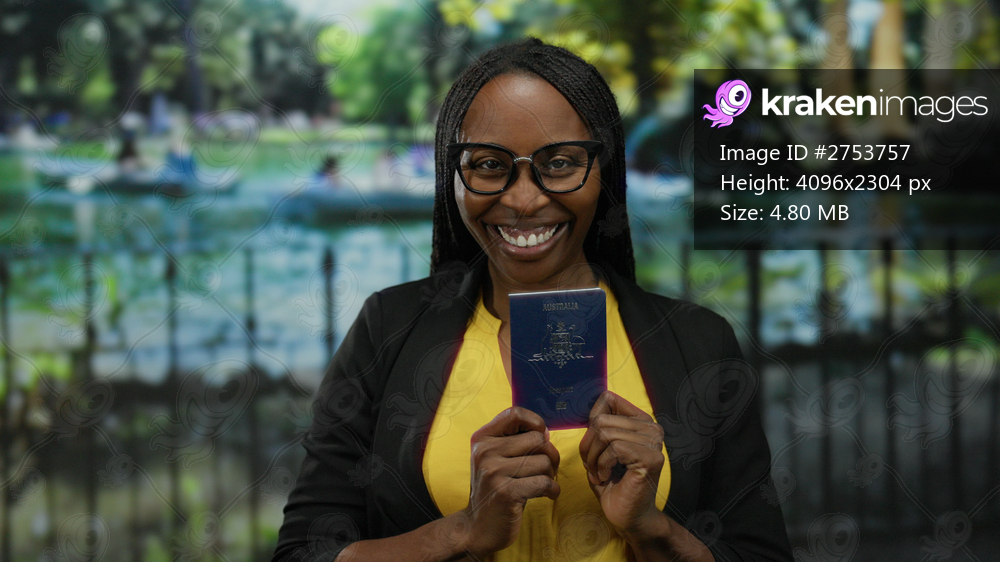 Woman with glasses holding australian passport smiles in sunny park with trees and people relaxing by water.