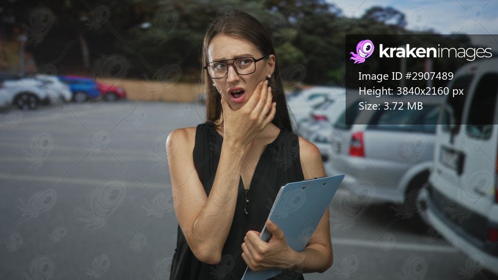 Woman with glasses holding clipboard touches jaw with hand for toothache in a parking lot on a street among parked cars; toothache concern.