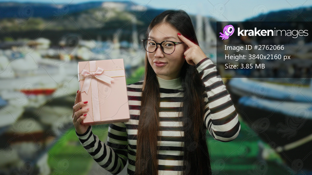 Woman with glasses holding gift at seaside port with boats in background, wearing striped shirt, making playful gesture.