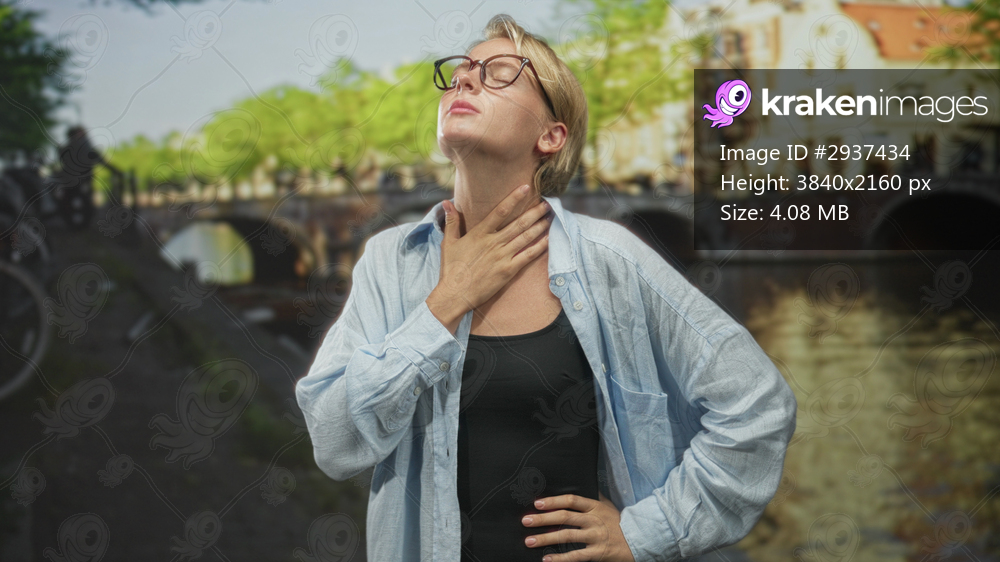 Woman with glasses holding hand over mouth and touching throat on canal street by bridge and water, wearing light shirt and black top; fatigue reflection. - Kraken Images