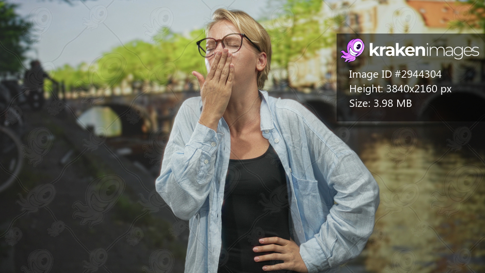 Woman with glasses holding hand over mouth and touching throat on canal street by bridge and water, wearing light shirt and black top; fatigue reflection. - Kraken Images