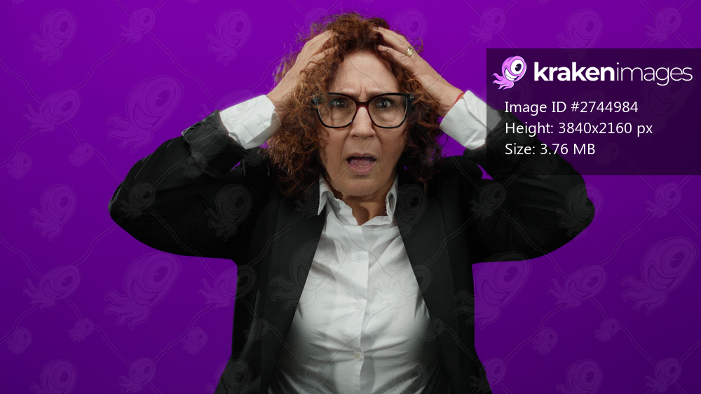 Woman with glasses holding head in frustration against vibrant purple background, wearing business attire, expressing stress and emotion.