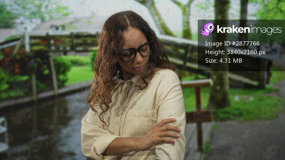 Woman with glasses holding her arm on a street in amsterdam near a canal bridge; quiet physical discomfort.