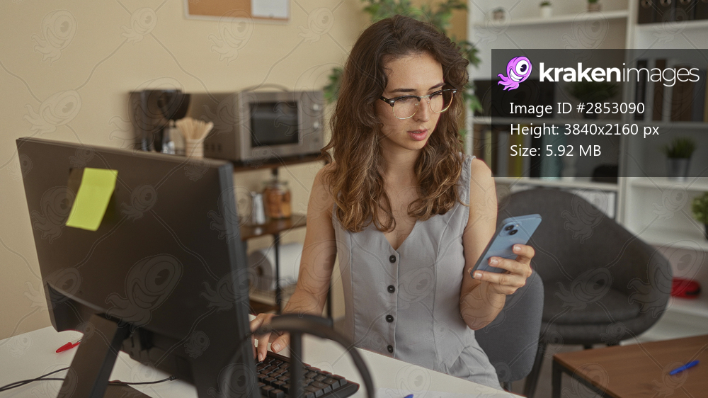 Woman with glasses holding smartphone and typing on computer in building; concentration productivity.