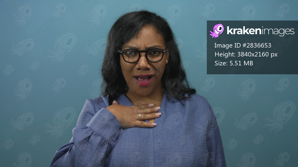 Woman with glasses holds hand to chest in studio with blue wall and shocked expression at camera; surprise.