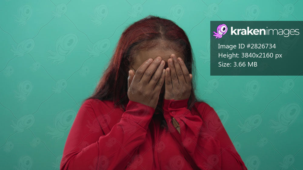 Woman with glasses holds hands to face in studio against turquoise backdrop; bold resilience confidence.