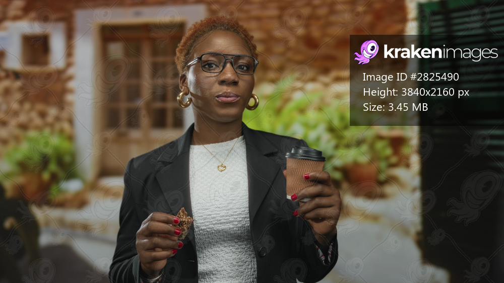 Woman with glasses and hoop earrings bites cookie and holds coffeecup at building entrance; morning enjoyment.