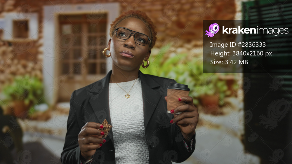 Woman with glasses and hoop earrings bites cookie and holds coffeecup at building entrance; morning enjoyment.