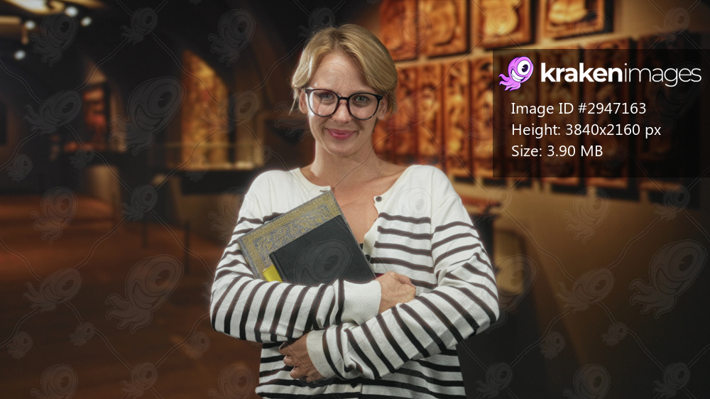 Woman with glasses hugging books to chest, striped sweater, smiling amid carved panels in a museum building gallery lit by warm amber lights; quiet contentment. - Kraken Images