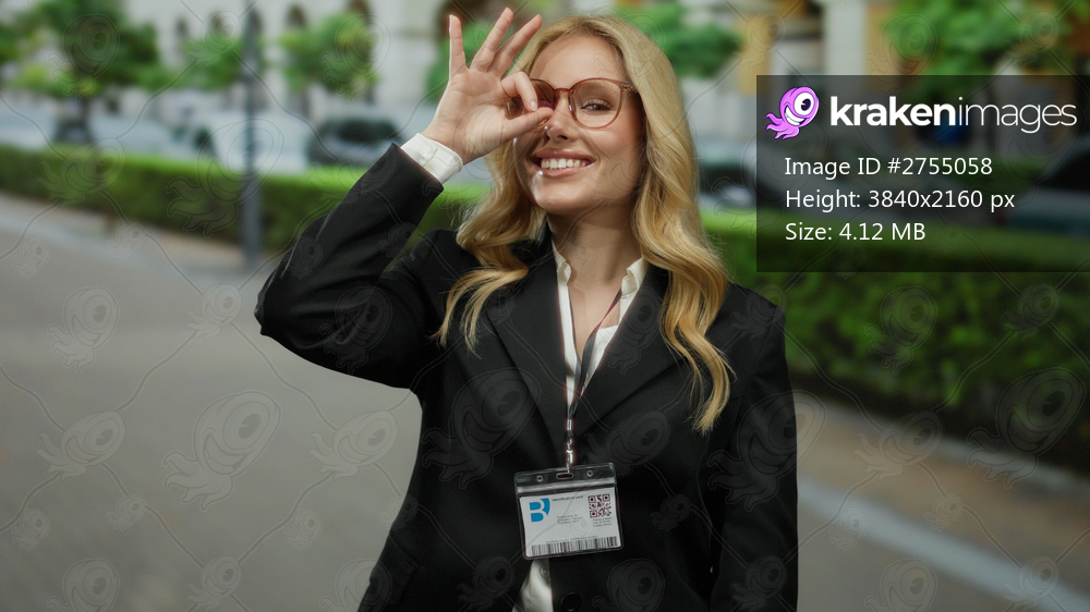 Woman with glasses and id badge gestures while standing in a city street, showcasing business attire and professional demeanor against an urban background with cars and greenery. - Kraken Images