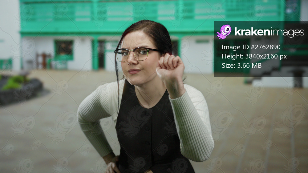 Woman with glasses in a mexican village gestures animatedly in front of a colorful building, showcasing curiosity and intrigue in an outdoor setting.