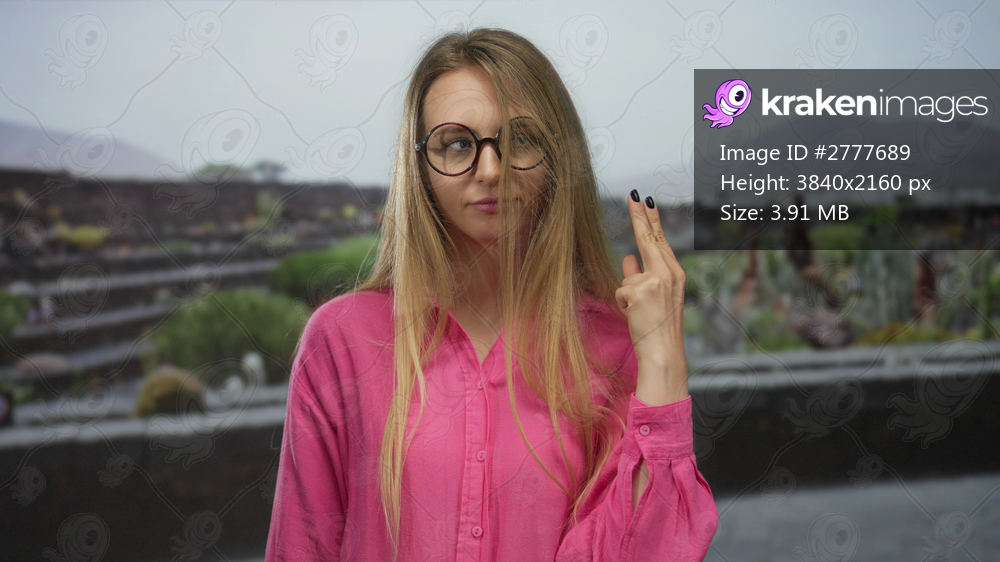 Woman with glasses in a pink shirt stands outdoors in a city backdrop, showcasing a thoughtful expression surrounded by urban landscapes and nature.