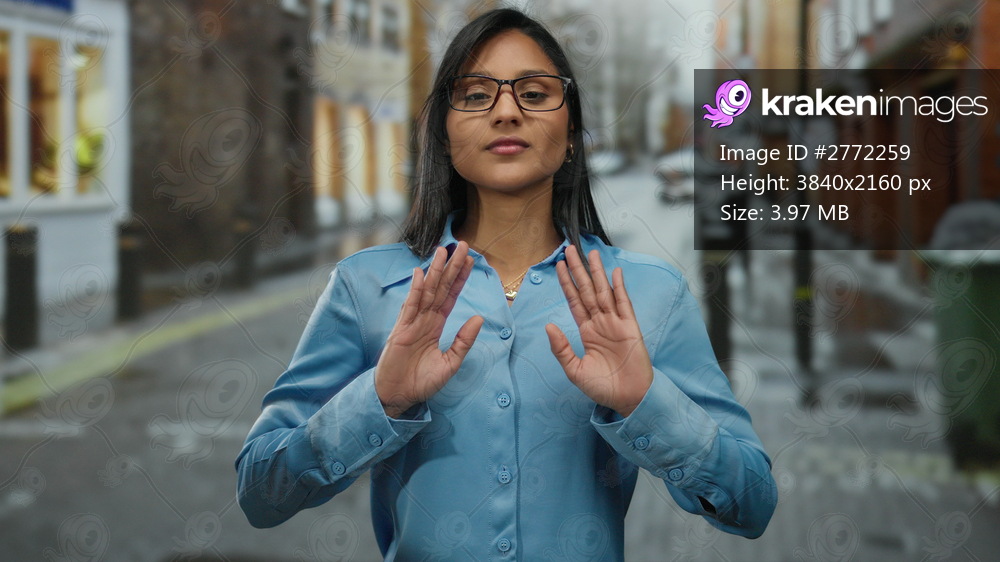 Woman with glasses in blue shirt gesturing on urban street, young and focused, conveying calm and understanding in an outdoor city environment.