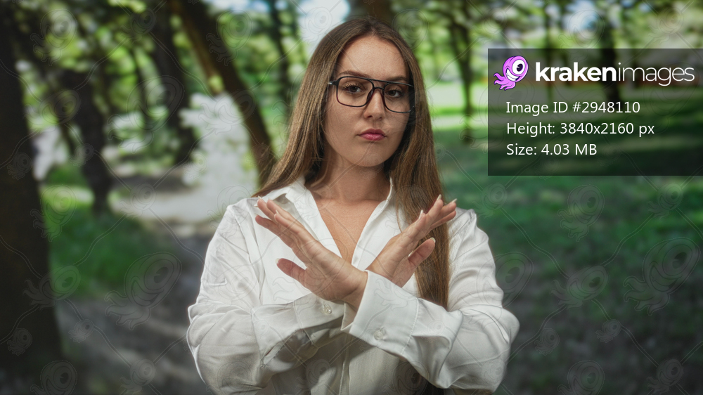 Woman with glasses in white shirt crossing hands in front of chest in forest, standing with stern expression and hands forming an x; rejection boundary. - Kraken Images