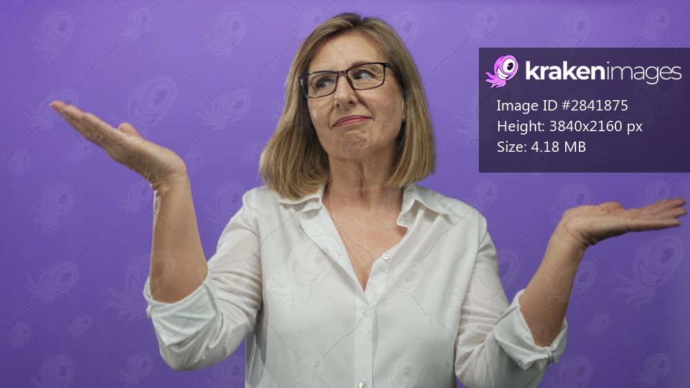 Woman with glasses in white shirt holds both palms up in studio; uncertainty hesitation doubt perplexity.