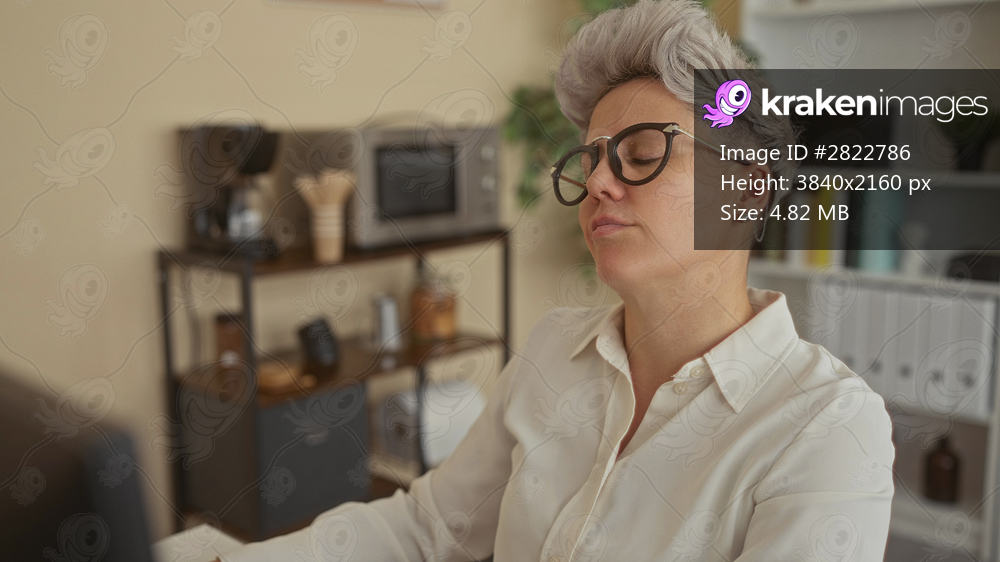 Woman with glasses leans forward at computer monitor on desk in office surrounded by shelves and a coffee machine; concentration.