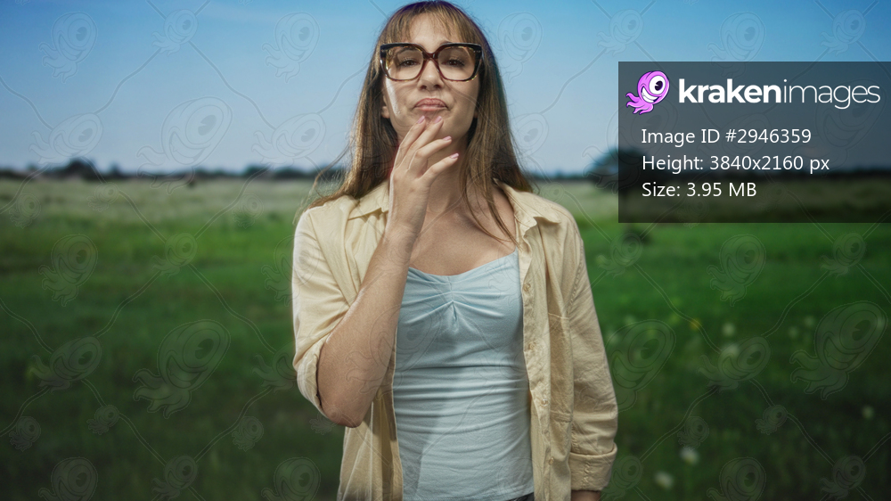 Woman with glasses and light shirt holds collar edge with hand, shows collarbone and points finger outward in forest; confidence.