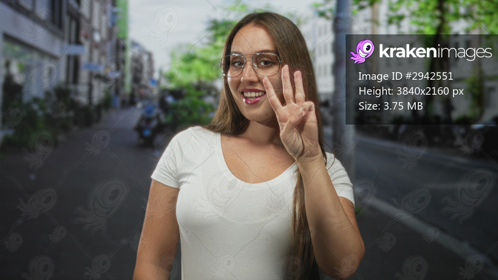 Woman with glasses and long hair holding up four fingers toward camera on a busy city street with blurred buildings and scooters; playful confidence.