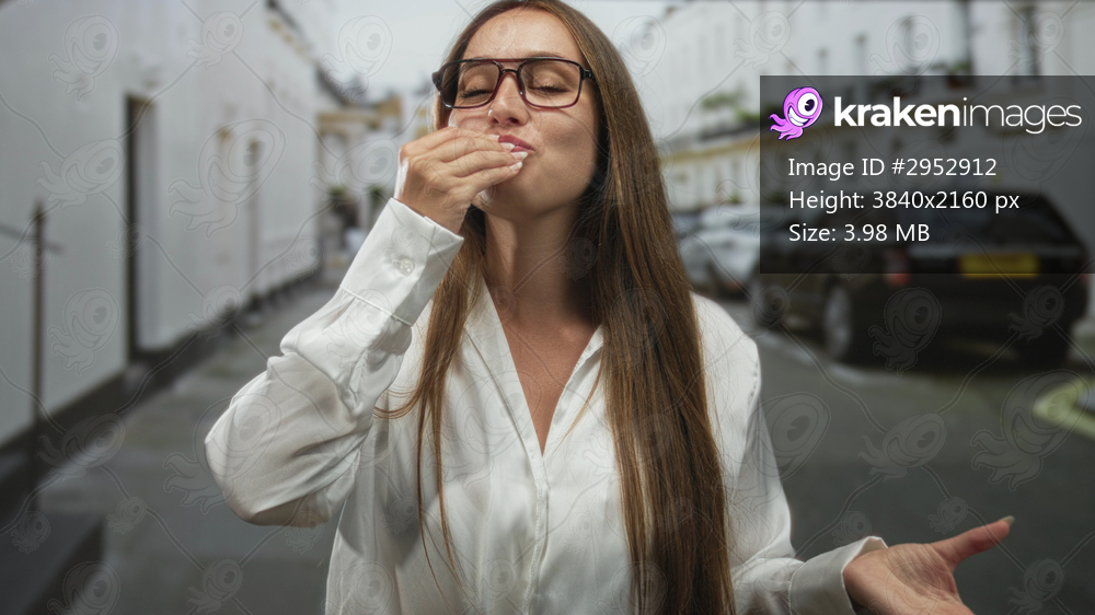 Woman with glasses and long hair in a white shirt blowing a kiss with both hands near mouth on a narrow city street lined with parked cars; playful joy. - Kraken Images