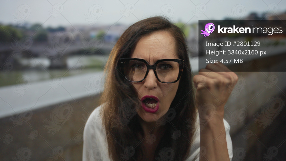 Woman with glasses and long hair raising a fist in an old town street outdoors, expressing determination in a vibrant and lively urban setting.