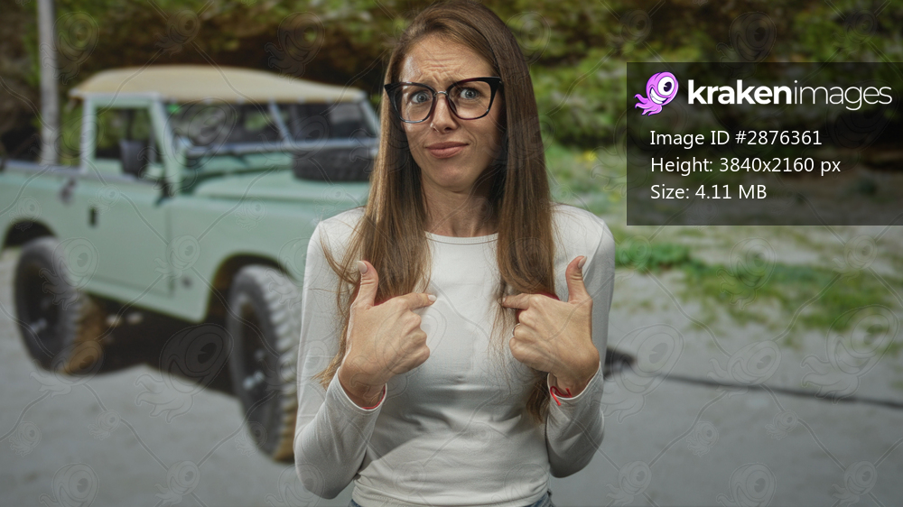 Woman with glasses and long hair, thumbs pointing to chest beside pale green suv in forest; confusion.
