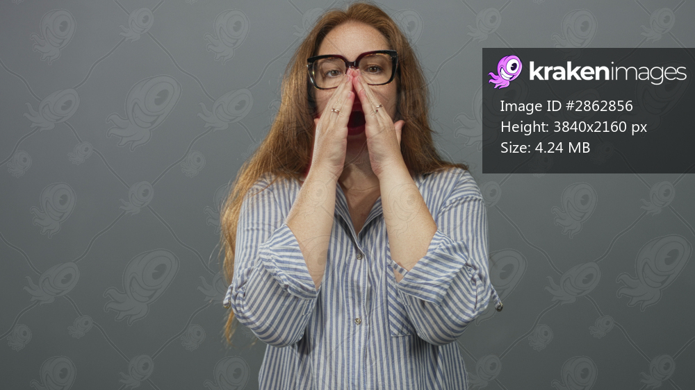 Woman with glasses and long red hair places hands over mouth in grey studio scene, wearing striped shirt; surprise.