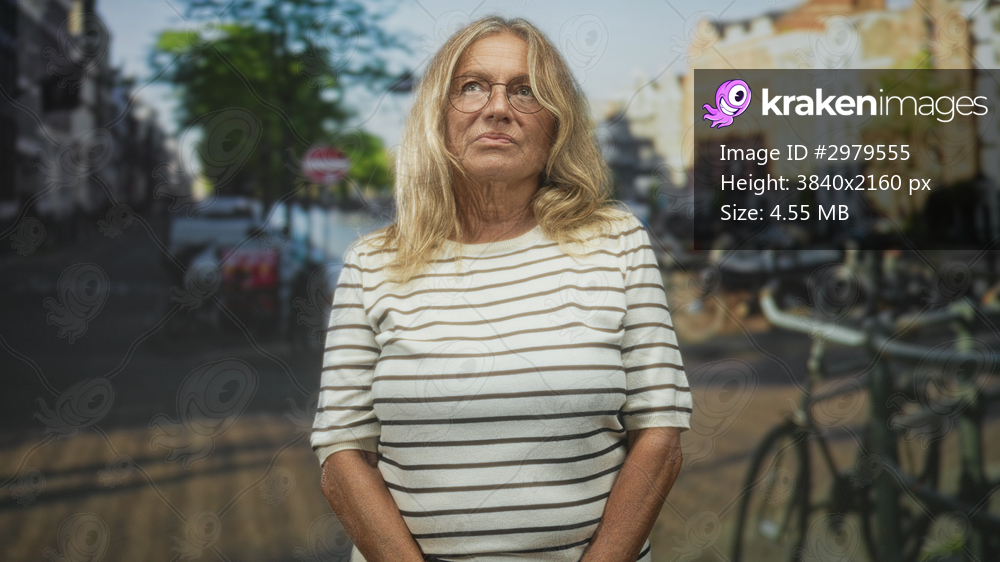 Woman with glasses looking up beside bicycle on street in city, wearing striped shirt and sweater; contemplation.