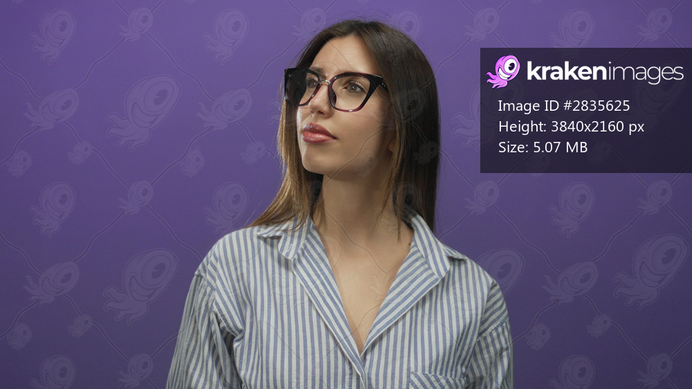 Woman with glasses looks up in purple studio; thoughtful aspiration creativity innovation.