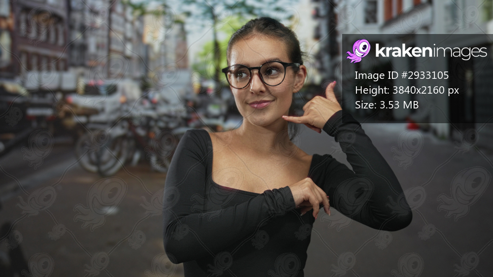 Woman with glasses making call me hand gesture on a city street lined with bicycles and brick buildings wearing a black long sleeve shirt; playful flirtation. - Kraken Images