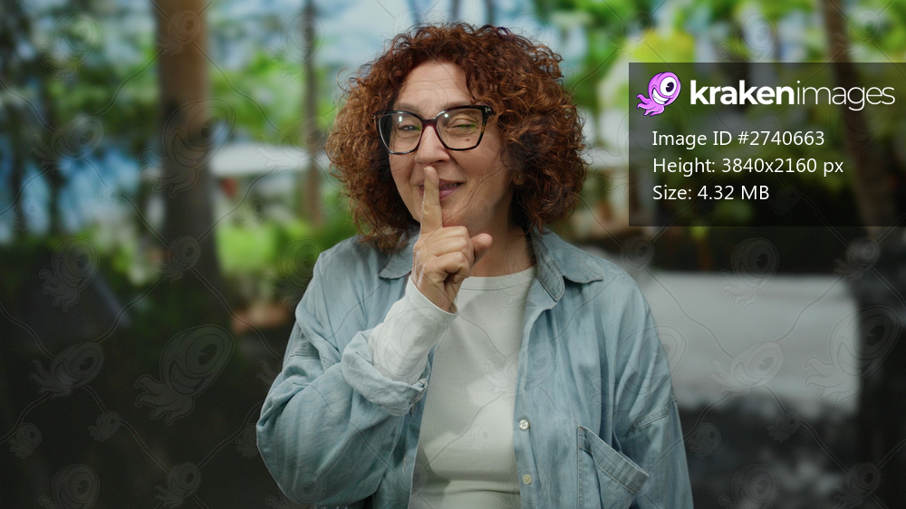 Woman with glasses making shushing gesture in a green park setting creates a serene and thoughtful atmosphere outdoors, suggesting tranquility and calm communication. - Kraken Images
